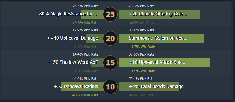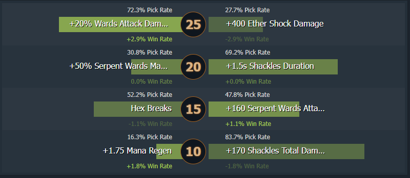 In terms of the Warlock Dota 2 facet, most people use the Champion of Gorroth option. It has a 73.64% presence and 54.39% pick rate. As for the Black Grimoire, it has a 26.36% presence and a 53.44% win rate.