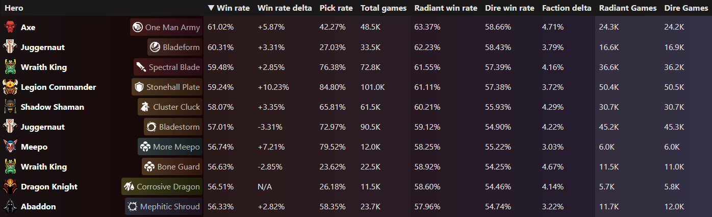 Wraith King with the Spectral Blade Facet rounds out the top three with a win rate of 59.62%.