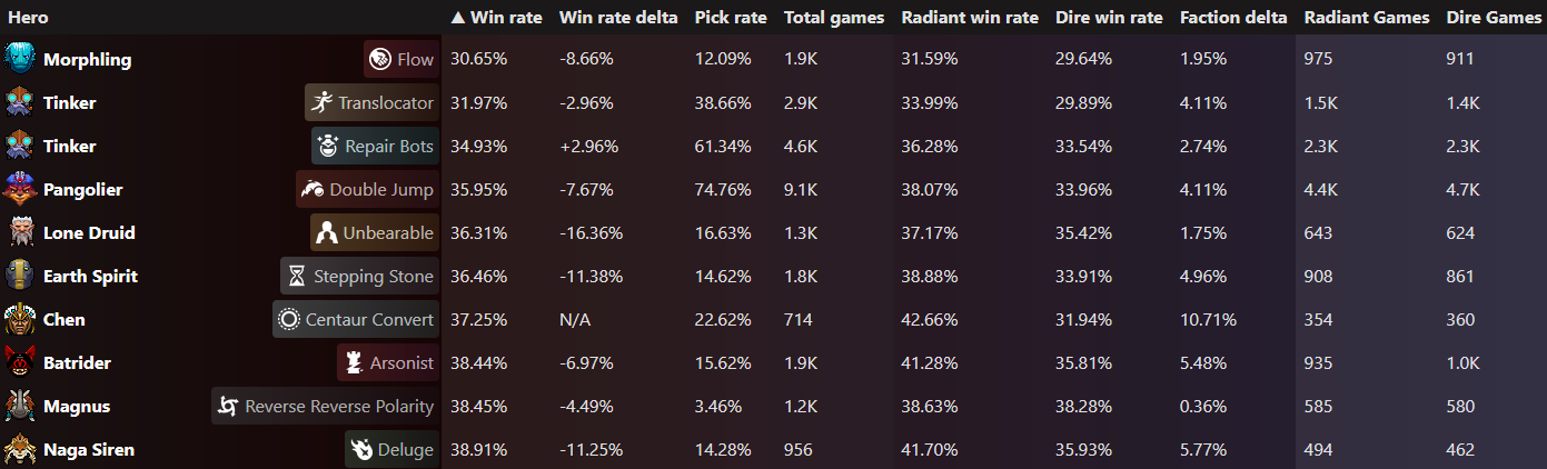The top loser of the patch is Morphling with Flow Facet. His win rate is 30.65%.