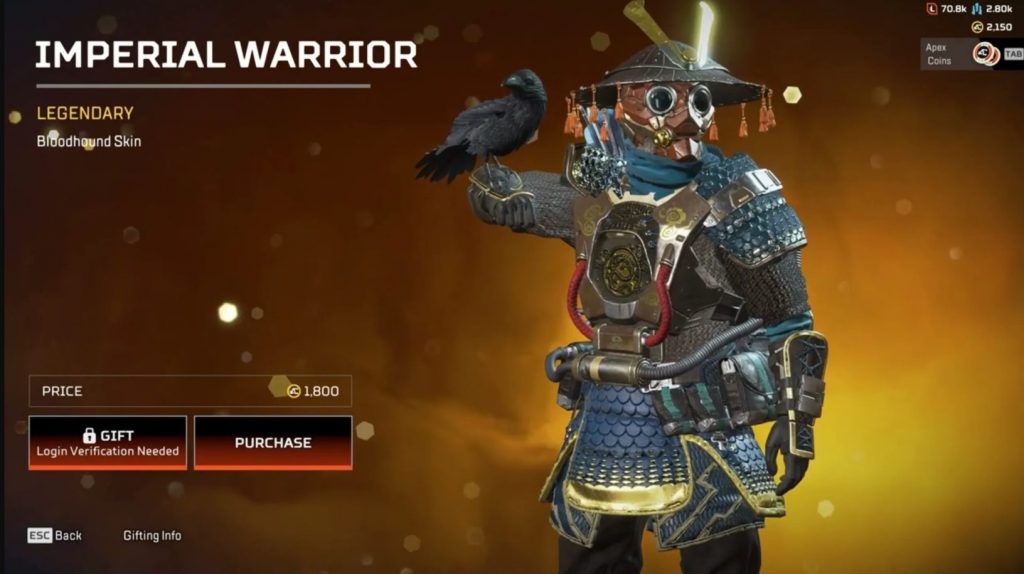 Even though that original skin had multiple recolors, this white one is scarce. The Japanese Samurai warrior-inspired skin goes well with Bloodhound.