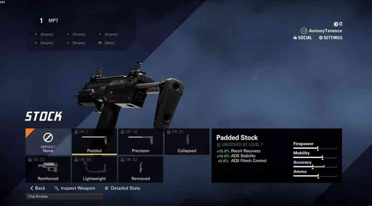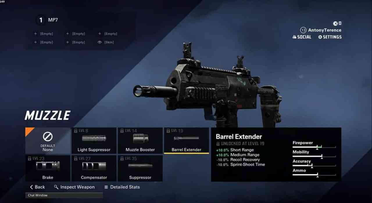 While the MP7 does excellent damage at close range, we will make it even more versatile by adding the Barrel Extender. This boosts its short and medium range at the cost of recovery and sprint speed.