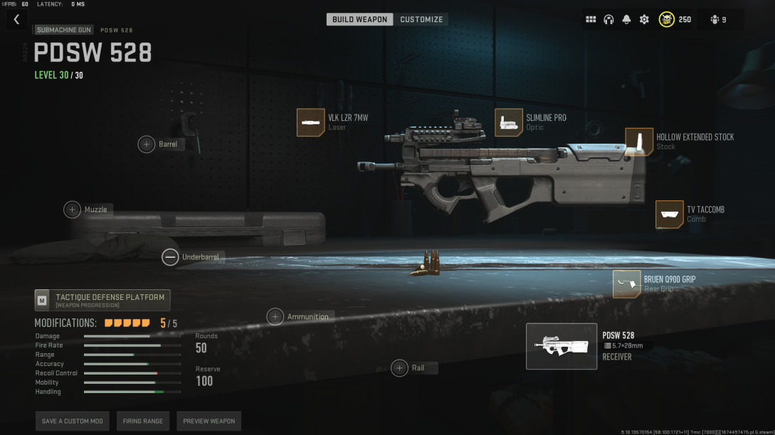 The PDSW 528 (P90) is also highly praised. This submachine gun comes standard with fifty rounds, and the bullet speed is excellent! Unfortunately, its TTK is relatively low. And too low damage is a significant disadvantage, despite the outstanding bullet speed.