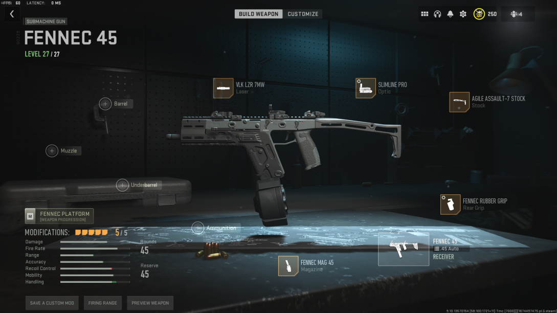 - Grip: Fennec Rubber Grip (Aim down sight speed -1.0, Sprint to fire speed -0.45)