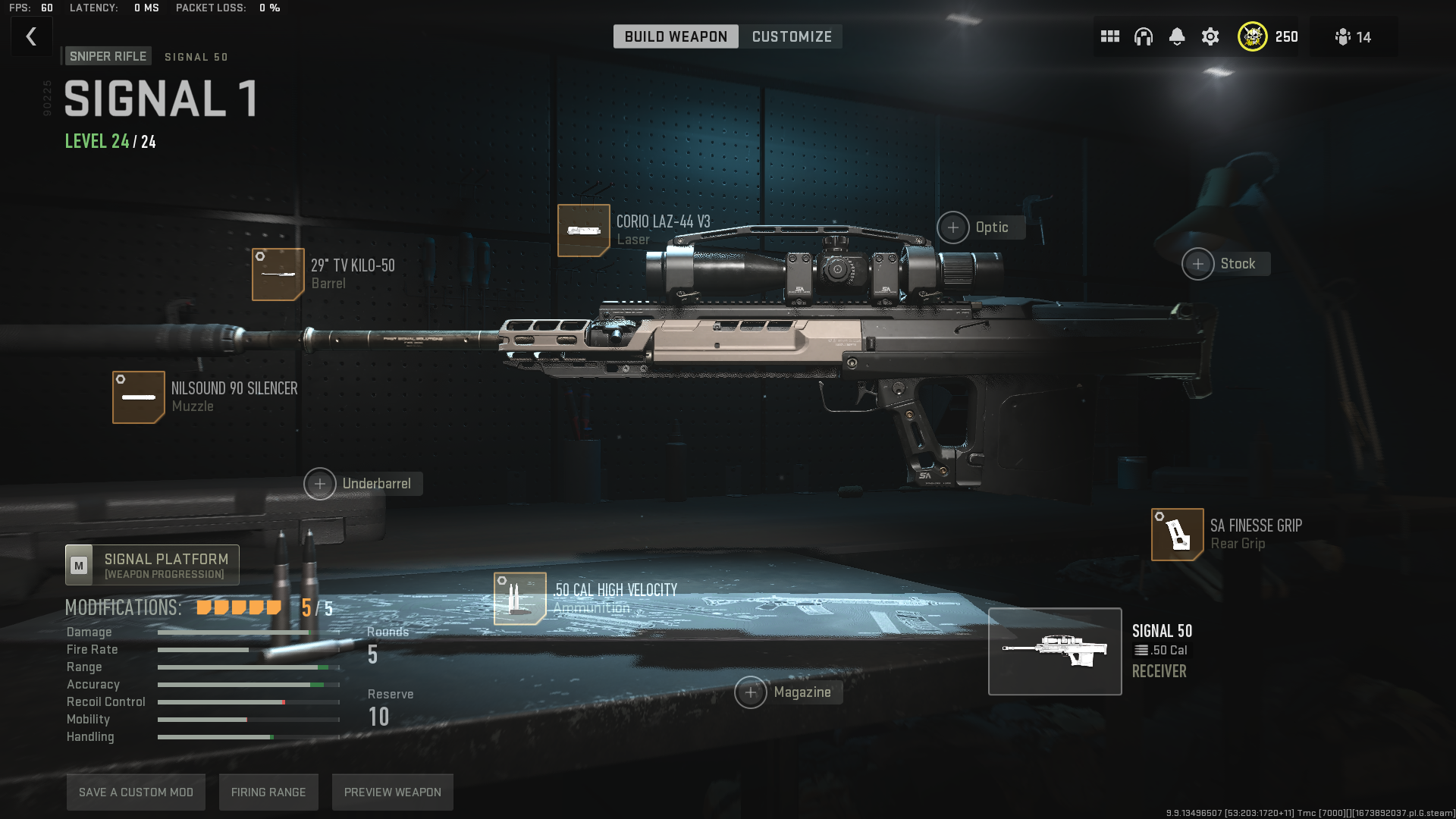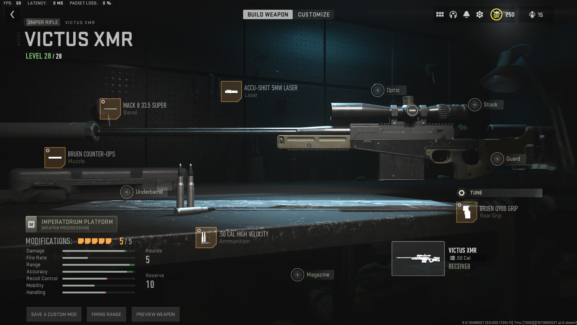 - Ammunition: .50 cal high velocity (Damage range +0.70, Bullet velocity +9.00)