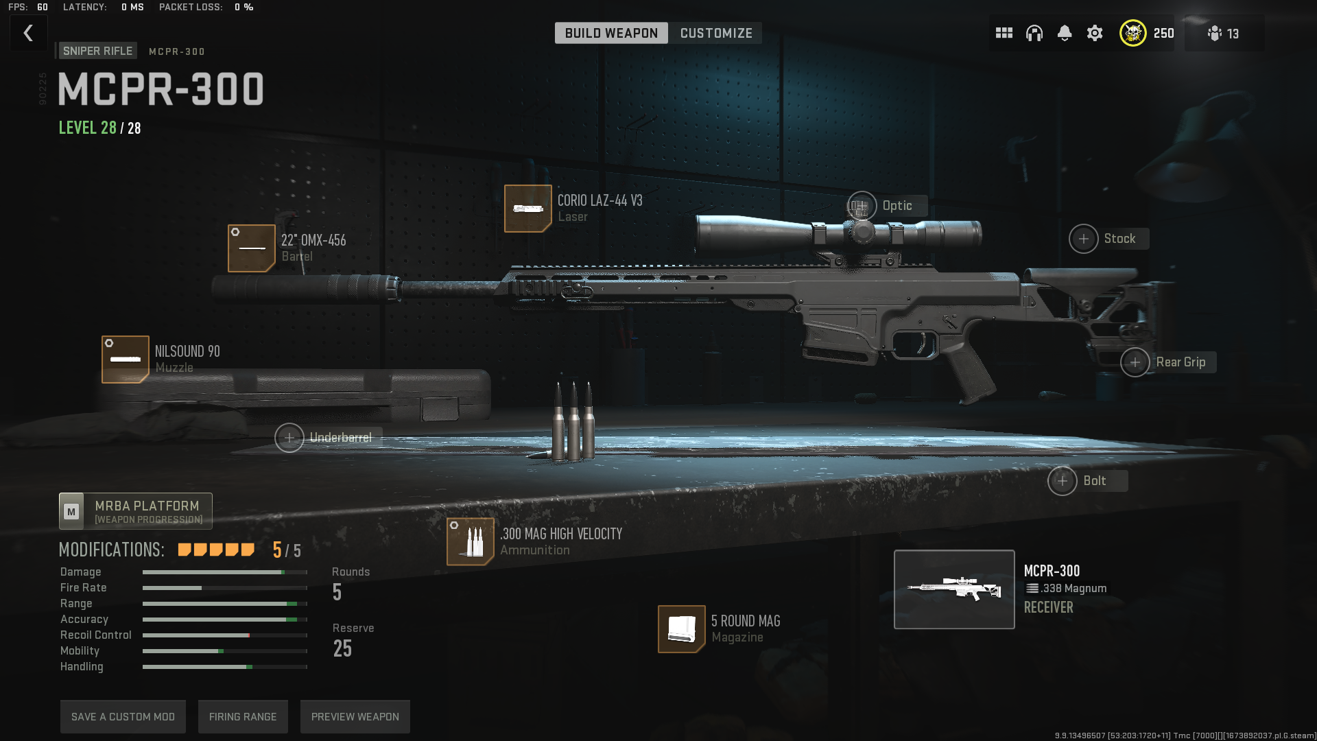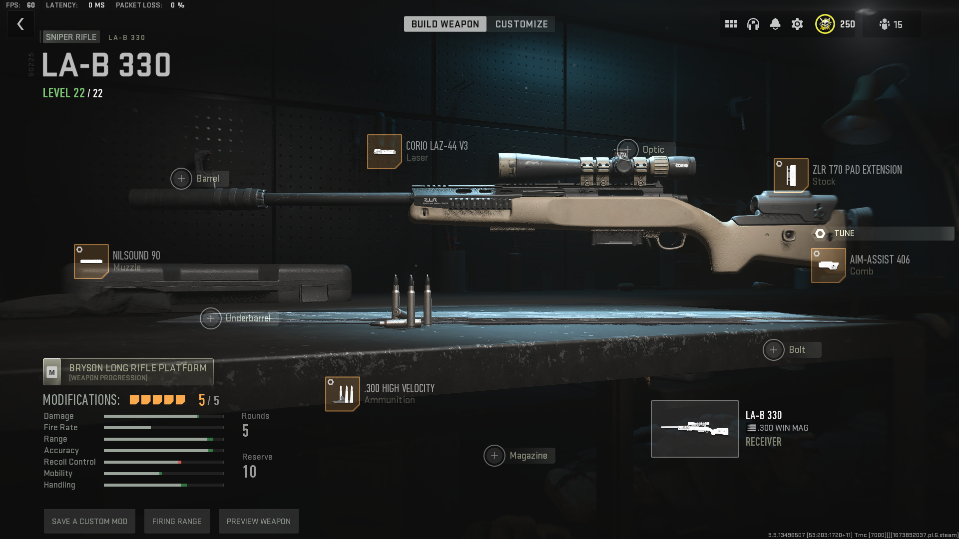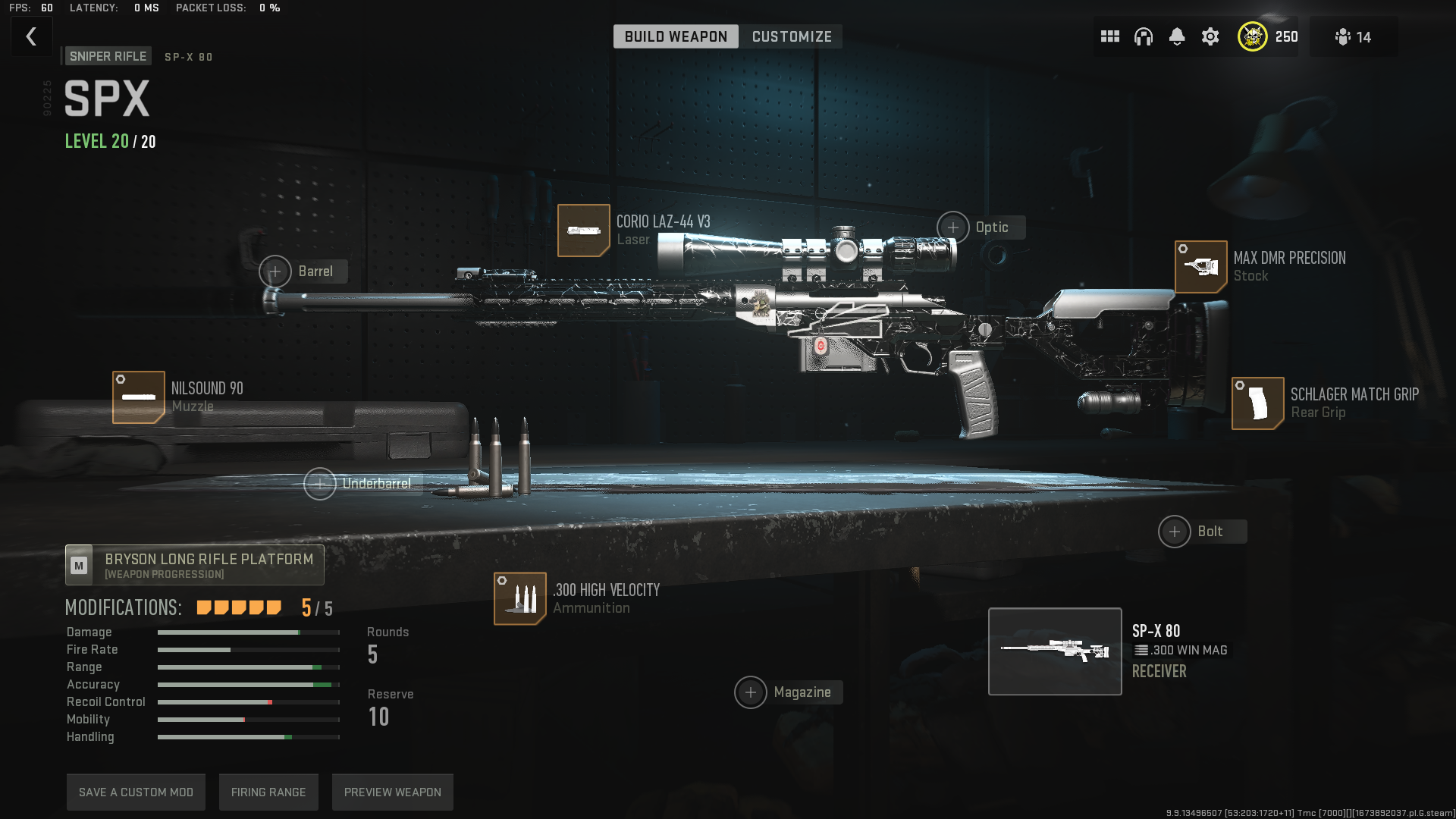 - Ammunition: .300 mag high velocity (Damage range+0.70, Bullet velocity +9.00)
