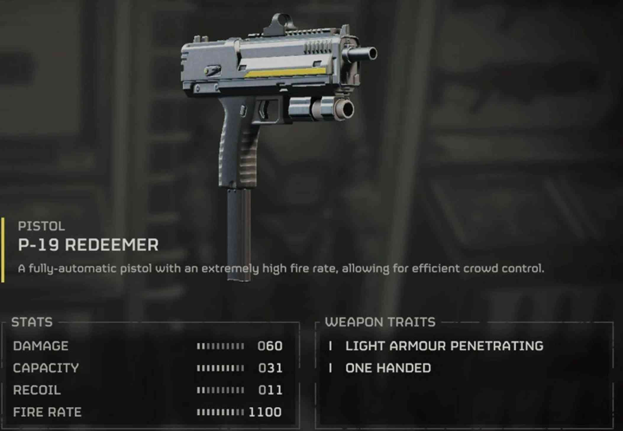 Complementary Weapons: Pair with faster, lighter weapons like the P-19 Redeemer.