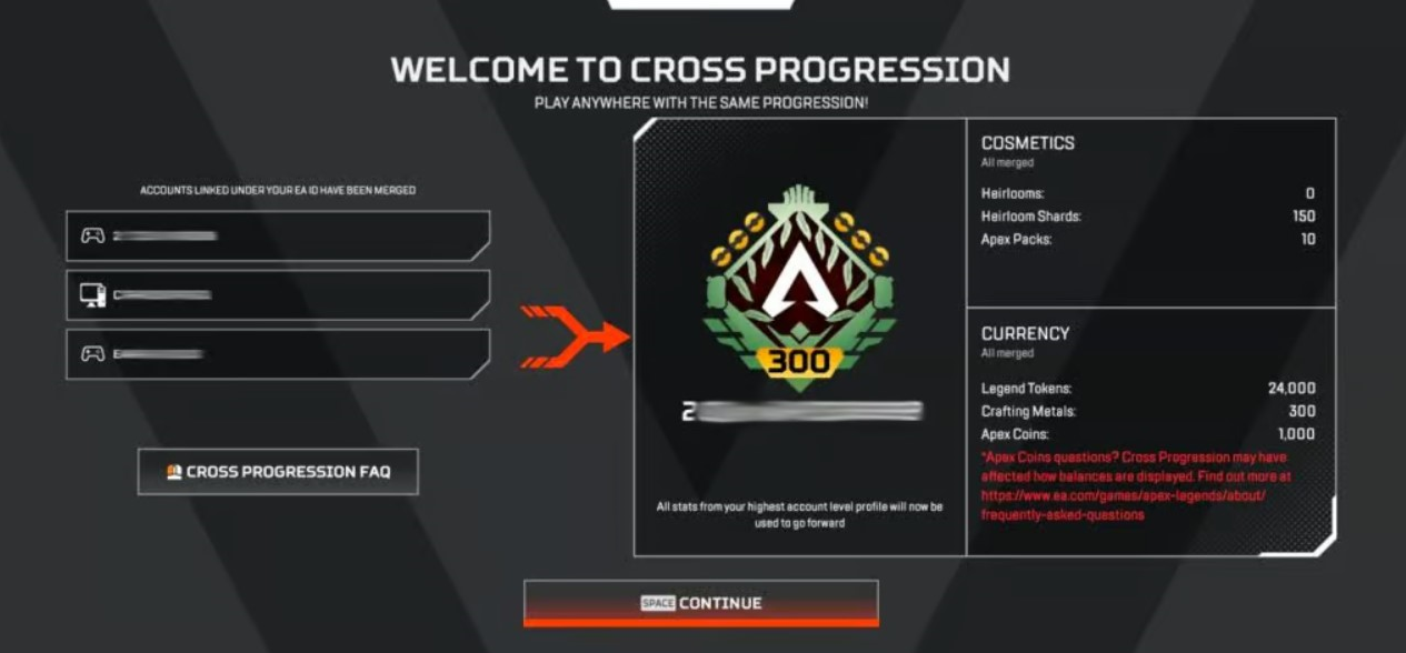 Cross-progression is primarily automated; your account will automatically alert you when it is available. When players with multiple Apex accounts are tied to a single EA account login, they’ll receive a cross-progression notification screen detailing their accounts and a simple control button.