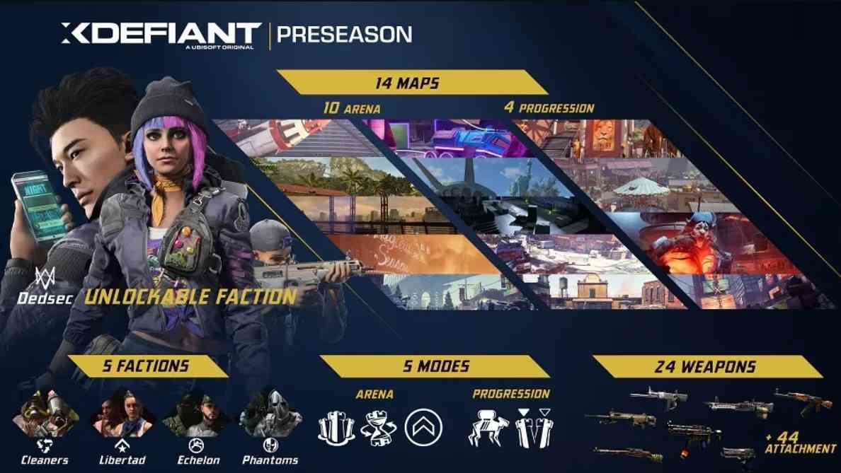 Also, XDefiant developers presented an infographic of the content: dozens of weapons and mods, five factions, 14 maps, and five modes.