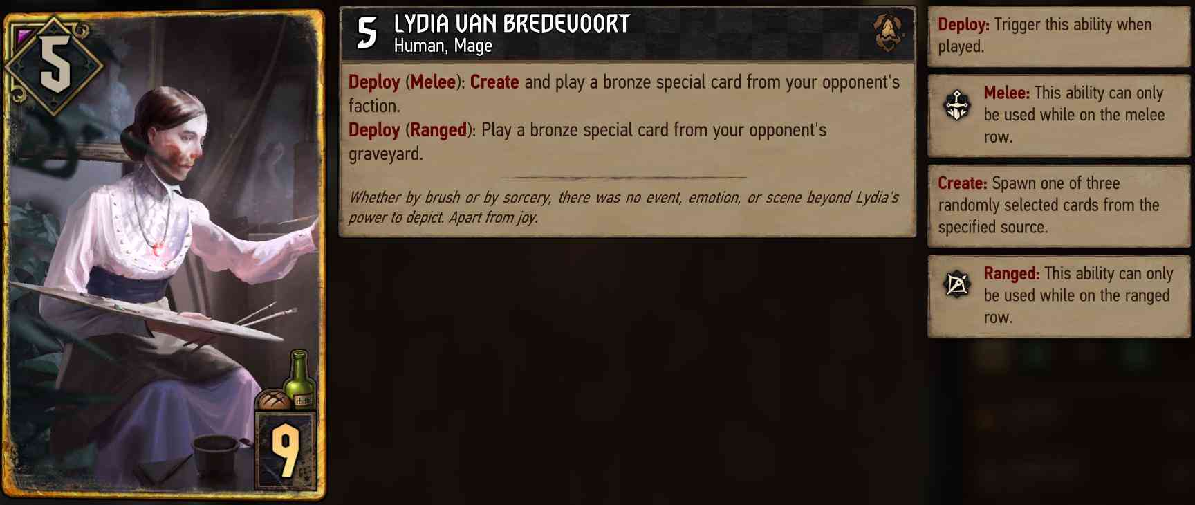 Lydia van BredevoortLydia is mostly played in assimilate decks to proc your engines but her versatility makes her just a decent card. She allows you to play a bronze special card from the opponent’s graveyard or create a brand new one from his faction. If you know what your options are, she can find great value.