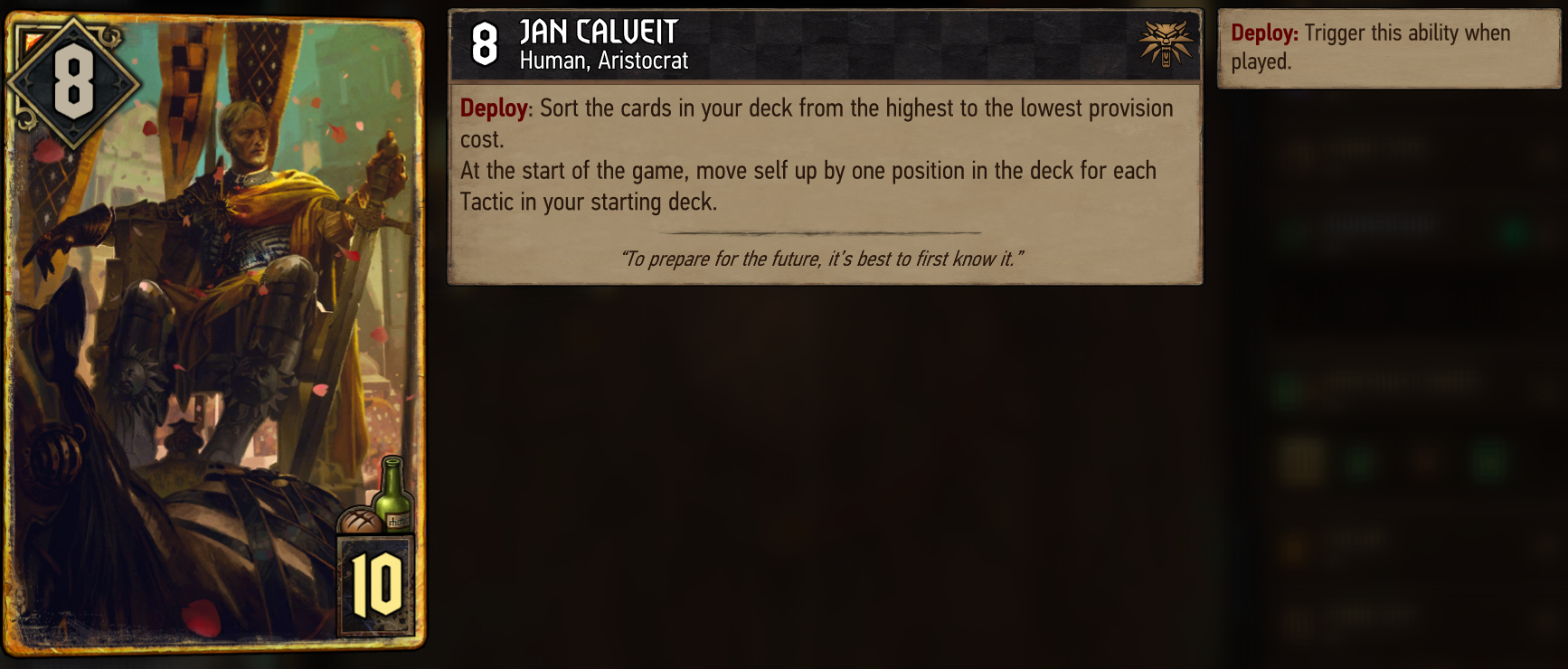 Jan CalveitThis card is designed for one purpose – to give you consistency. If you play it in round 1 it guarantees you to draw all your best cards as your deck gets sorted from highest to lowest provisions. You can utilize that to defend round 2 bleeds or go for swift 2:0 knowing you have all your best tools available to you. There are however some drawbacks to this card. The main one is – what if you don’t draw your Calveit round 1? It can be quite awkward as you just wasted 10 provisions for a card that plays for 8 points.