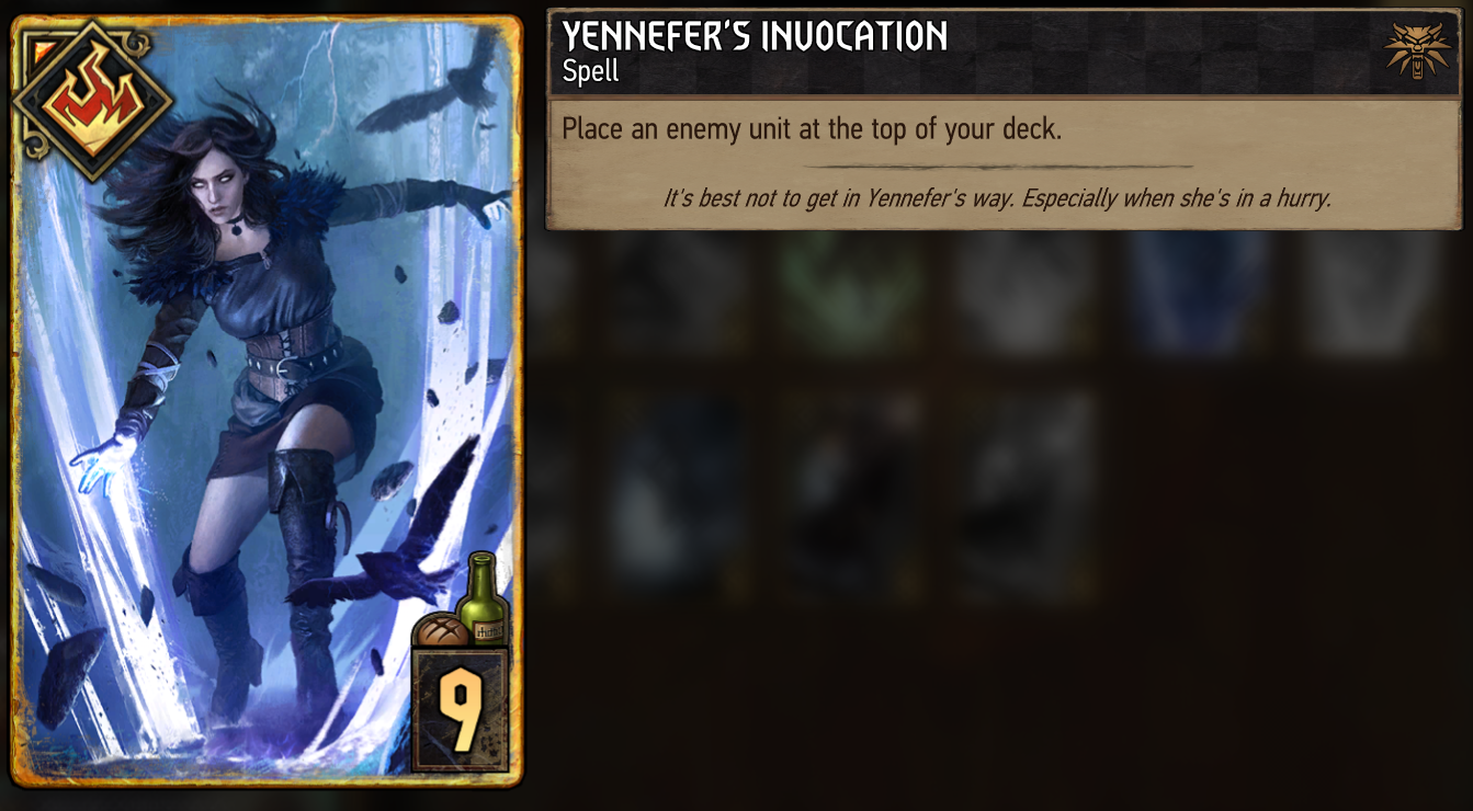 Yennefer’s InvocationGreat tall removal and another tool for stealing enemy cards. It allows you to put the chosen unit on top of your deck. It’s nice as removal but works even better if you can manage to use the card you put on top of your deck. This can be done in a variety of ways.