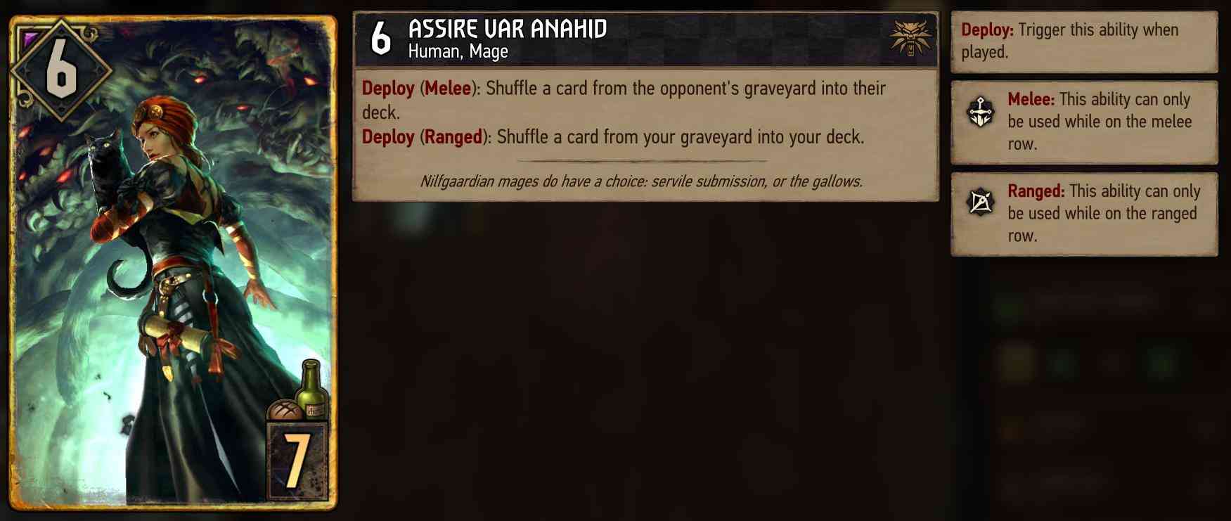 By playing assimilate you effectively learn how to use every deck you face. However, there are plenty of other viable Nilfgaard archetypes like soldiers, hyperthin, poisons, or tactics so everyone should be able to find something that fits his playstyle.