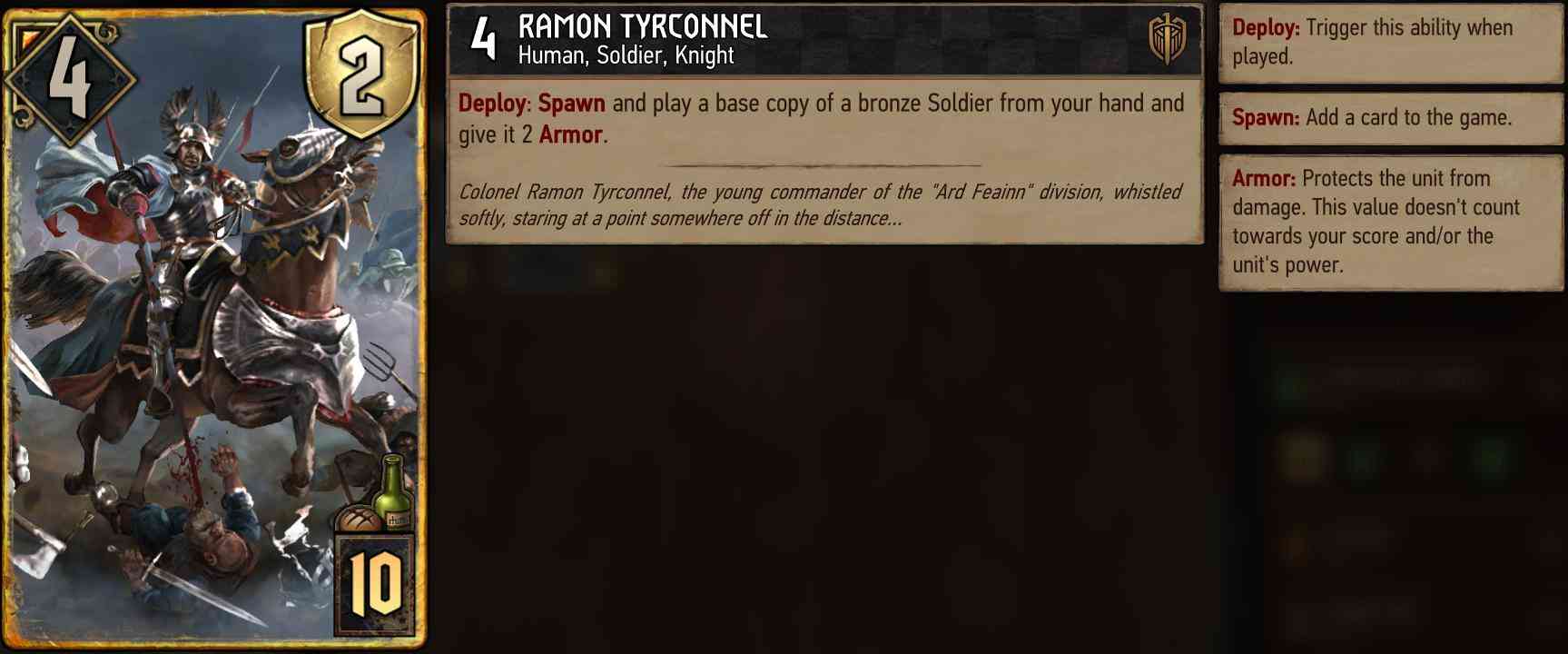 Ramon Tyrconnel Strong card with some great utility. It allows you to spawn and play any bronze soldier from your hand which opens many interesting options. It can be used on Alba Armored Cavalry for an extra lock, it can give you another Illusionist for that nice bonded ability or you can spawn an additional Ard Feainn Crossbowman.