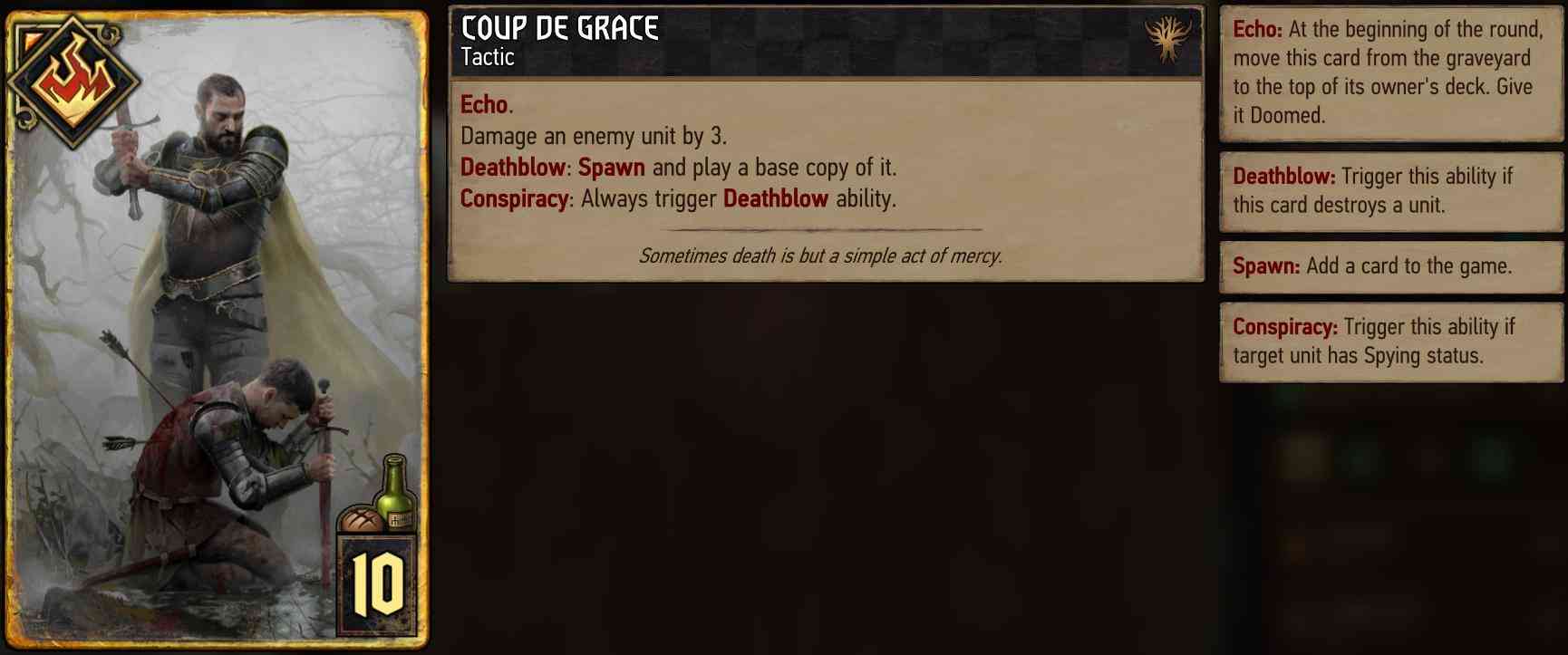 Coup de graceAnother key card for using the opponent’s deck against him. It allows you to copy any enemy unit as long as the condition is met. So you either want to use it on a unit with spying or make sure to get a deathblow with your 3 damage which will have the same effect. Just like with Artaud this opens many paths and can work wonders.