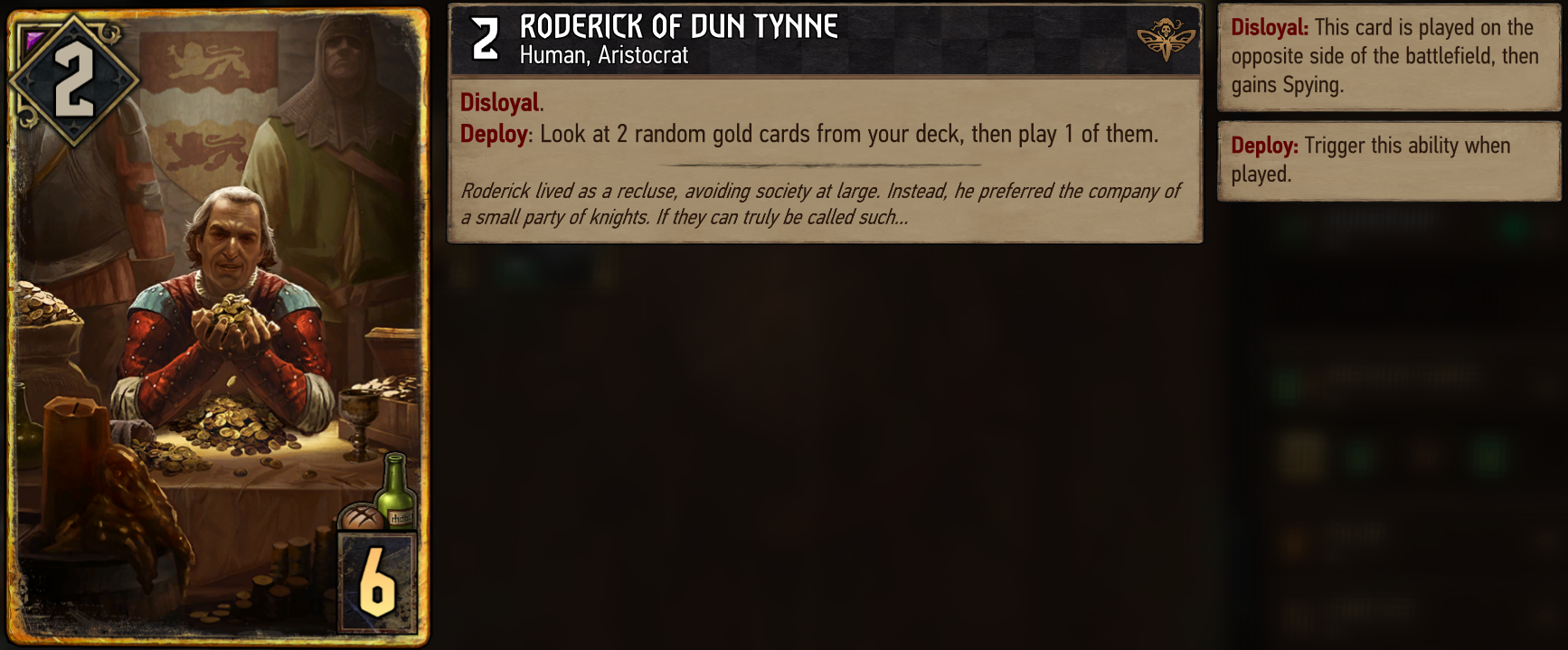 Roderick of Dun TynneConsistency tool used in many Nilfgaard decks. By giving two points to your opponent, you can look at two of your random gold cards and play one of them. You want to use him in a late stage of the game, so you better know what your random options are. If there are only one or two gold cards left in your deck, you know exactly what you’ll get.