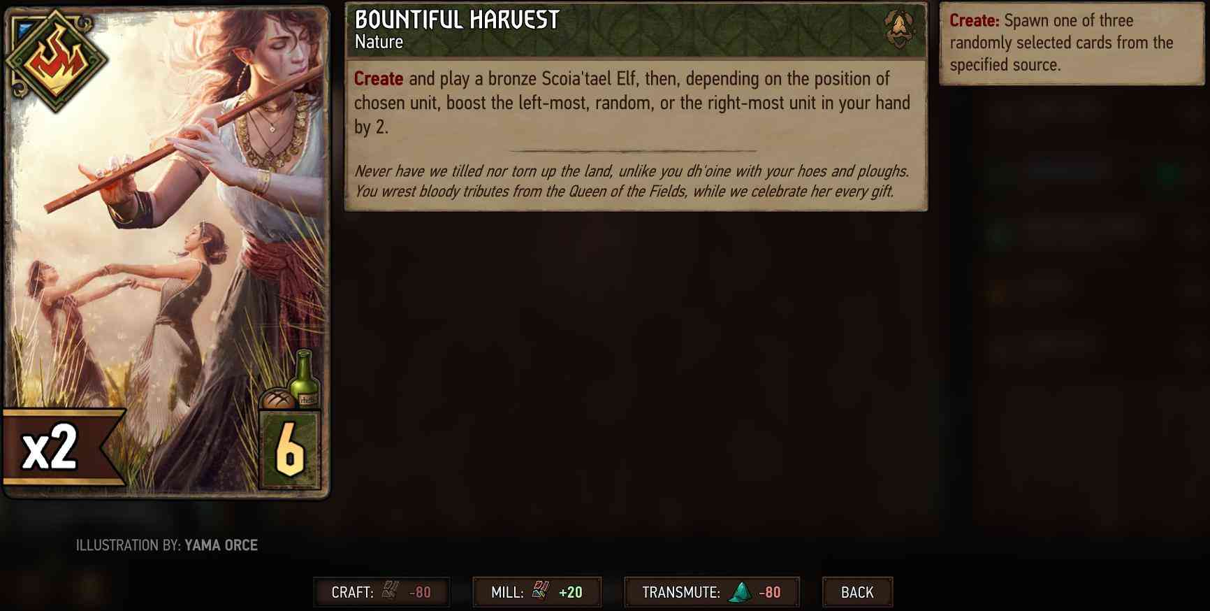 Bountiful HarvestThis bronze offers great value and provides nice flexibility. Firstly, it allows you to create and play Scoia’tael elf. This gives you options as many bronze elves can serve different purposes – moving units, purifying them, or creating additional specials. You don’t know what you’ll get as you have to pick from three random units, but Bountiful Harvest should give you something decent in most cases. Secondly, this special boosts a unit in your hand, which is the bread and butter of handbuff decks but is helpful in any Scioa’tael deck. Playing two Bountiful Harvests with Simlas enables some great combos. If you’re lucky with your random units, you can get Sorceress of Dol Blathanna and Elven Seer for many additional points. All in all, Bountiful Harvest is just a good bronze that has a lot of utility.