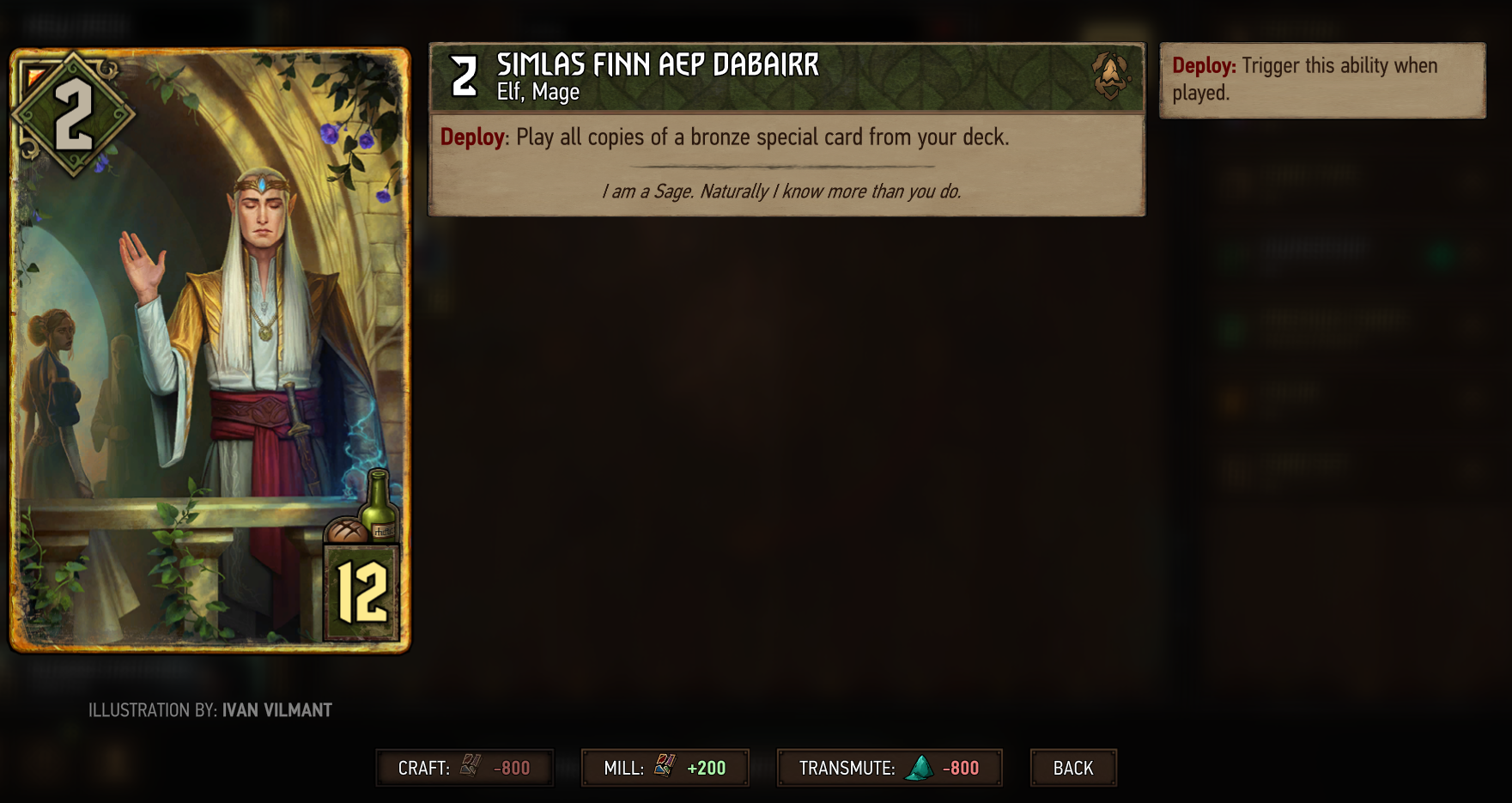 Simlas Finn Aep DabairrBeing one of Scioa’tael’s most powerful cards, it allows you to play all copies of a special bronze card from your deck. Usually, that means two copies, but certain decks can play even five copies of the same card if navigated correctly. Simlas a powerful play that can easily win a short round, even a card down. The usual target for Simlas is either Bountiful Harvest which allows you to play additional elves and boost units in your hand, or Waylay for control/removal and spawning elves on your side of the board. The truth is Simlas is so strong it fits most Scoia’tael decks, even if their strategy doesn’t revolve around him.