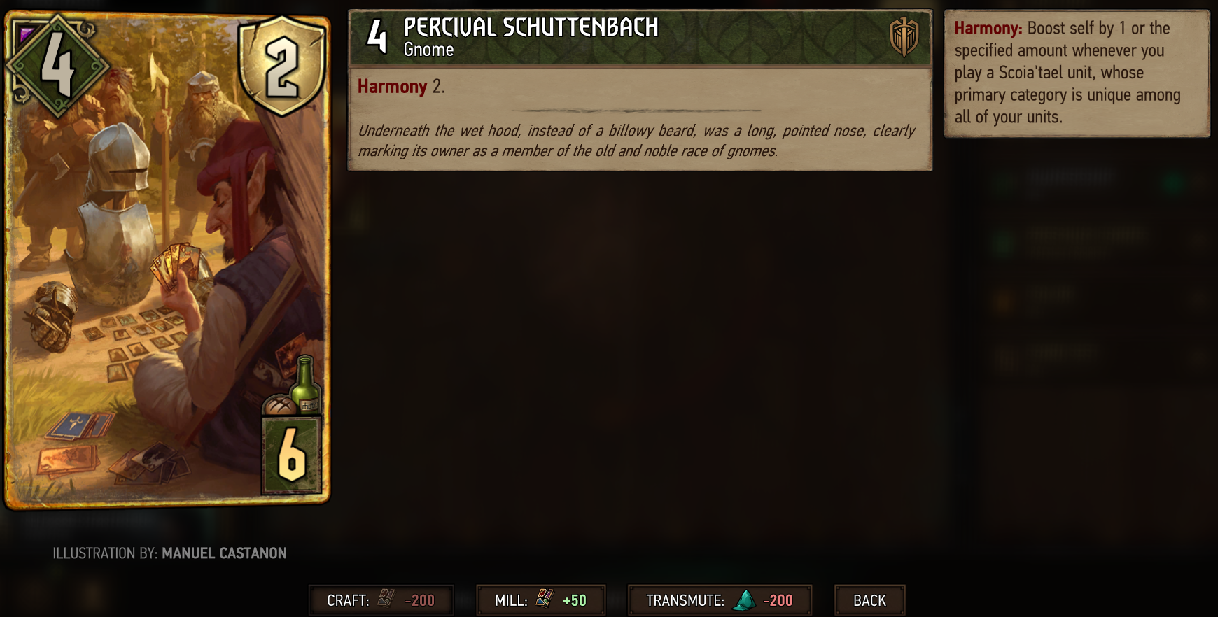 PercivalThis card is sound because of one main thing – it is cheap. 6-provision card that grows by two with each proc fits any harmony deck. In a long round, it can grow to 20+ points which is crazy for six provisions. Your opponent needs either a lock or six damage to shut down this card which might be expensive for many decks (outside Nilfgaard, obviously). Percival is simply a powerful and cheap engine.