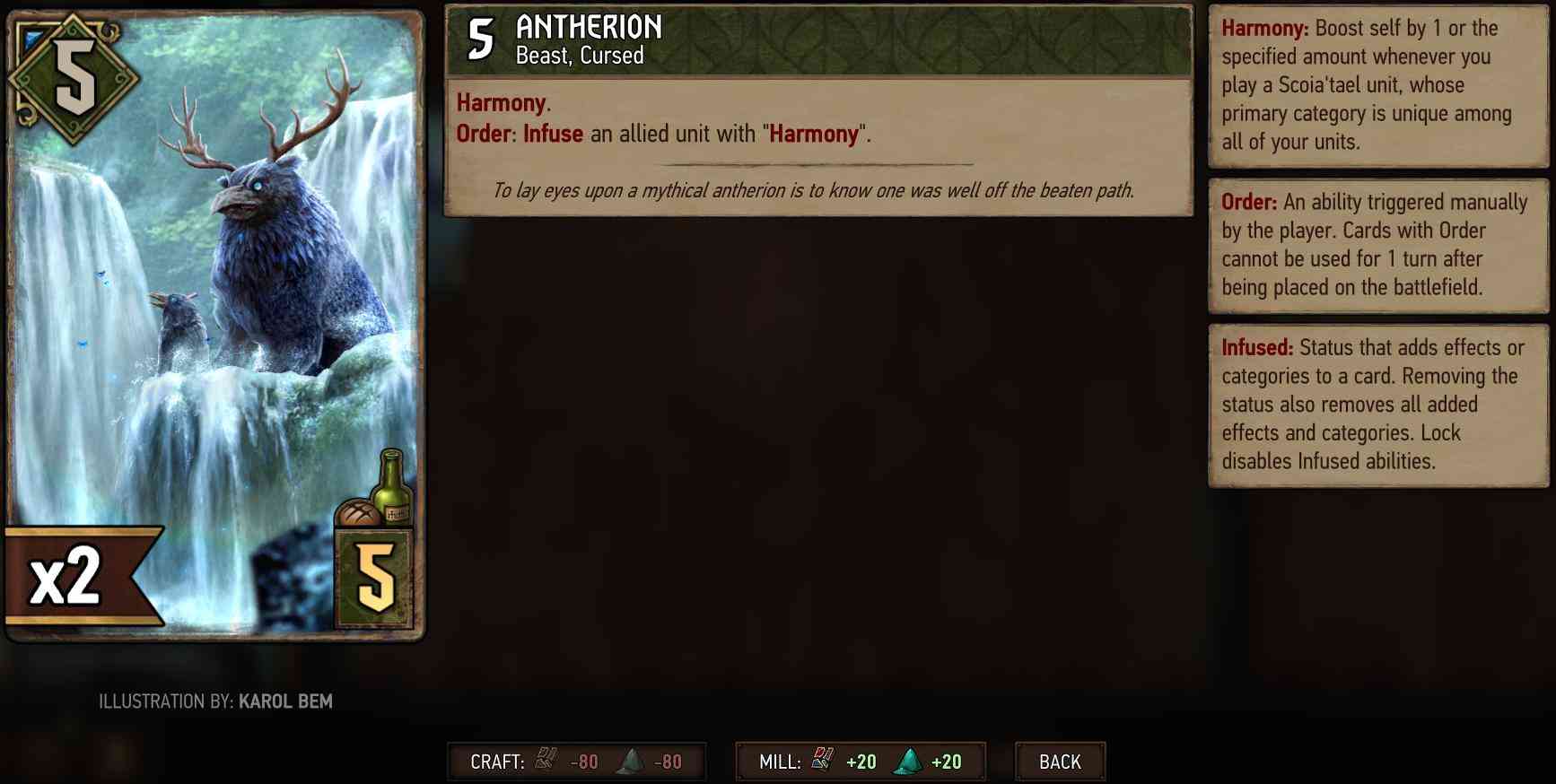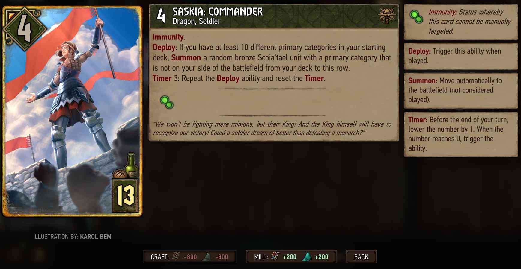 Saskia: CommanderSaskia is a great card that gives you value in more than one way. She pulls units from your deck every few turns, giving you many extra points and allowing you to put more than one unit per turn on your board. This poses a severe engine overload threat for the opponent as it’s hard for him to answer everything. It might be too much for many decks, which wins you the round. Ideally, you want to play Saskia in round 1. This should give you round control because it’s much easier to win with her on the board. Playing her also thins your deck as she pulls out bronze units, meaning you have higher chances of drawing your gold cards. She is so essential in round 1 that many decks decide to run Cursed Scroll as their strategy to ensure they have access to Saskia. The card has immunity which means it can’t be directly targeted and is very hard to answer. The ways of removing her are minimal, and she rarely gets responded to. Just note that she requires specific deckbuilding to work (you need at least ten different primary categories on your cards). Meeting this requirement is not hard, just something to mind when creating the deck. Also, watch for including bronze units that get the most value through their deploy ability – like Dwarven Skirmisher, for example. If your Saskia pulls him from your deck, you miss a lot of points as he is worth just 1 point, which is terrible. So if you plan on playing Saskia, include only bronze units that represent value regardless of how they get to the board. Cards like Antherion, Cat Witcher, or Dryad Matron – to name a few.