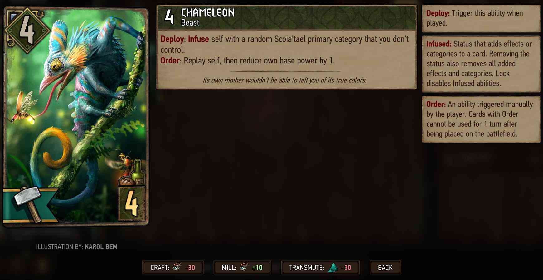 ChameleonAnother important card if you want to play harmony. Very cheap but able to give you insane points. These cards can replay themselves once a turn proccing all of your harmony engines. This effectively means that your every engine can grow two times each turn – once due to Chameleon and once due to your regular card. Or even three times if you control two Chameleons. That is so many points; most decks will have severe problems catching up. The tricky part about Chameleon is knowing when to play him. You don’t want to do it too early as there is nothing to proc but neither too late because Chameleon won’t have enough time to snowball. This card prefers longer rounds – just like the whole harmony archetype.