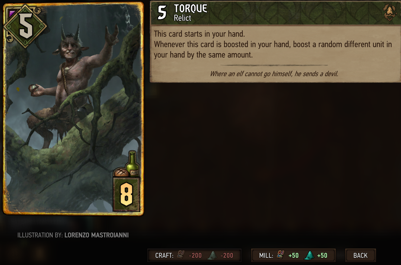 TorqueTorque is the way to go if you plan on playing the hand buff archetype. It is not the strongest at the moment but very fun. The thrill of ‘where will the buff go’ is unique to handbuff, as is the joy when this huge buff lands on your Sheldon or Aglais. Torque always starts in your hand, so you don’t have to worry about not drawing him. And whenever it gets boosted while in your hand, it randomly boosts another unit for the same amount. Certain plays let you get the most value from this card. One is boosting every card in your hand – except Torque – with your leadership ability and then playing Farseer on your Torque. If done at the start of a first round, it will boost him by 7 or 8 points and give the same boost to another unit in your hand. And when Torque is the most left or right card in your hand, you can boost him with Bountiful Harvest by picking the corresponding unit. Scoia’tael has many ways of hand-boosting units, and your Torque will usually end up at around 20+ points giving your other units some serious buffs.