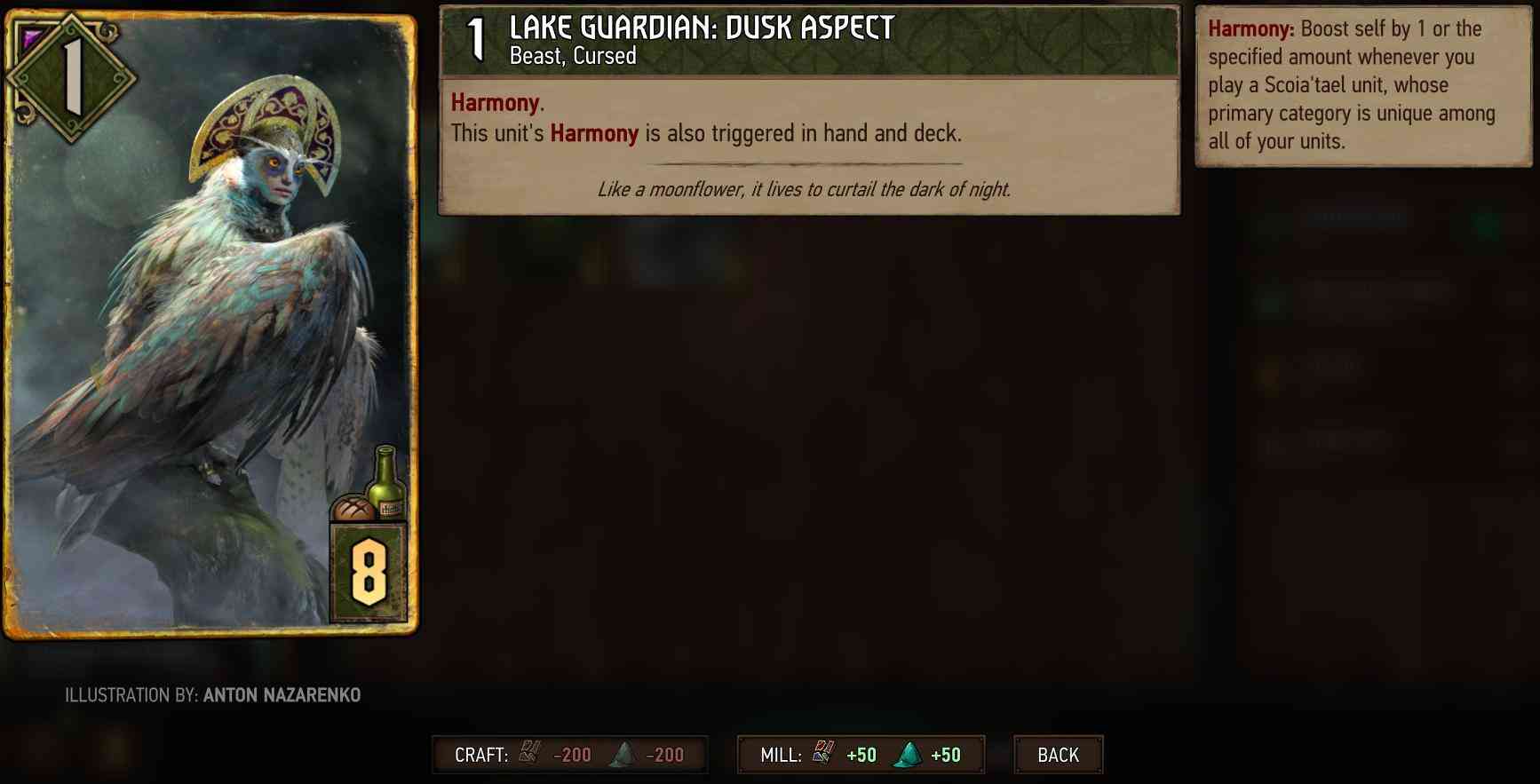 Lake Guardian: Dusk Aspect The big finisher harmony is always needed. This harmony engine procs even if it is in your hand or deck. If you are all-in on harmony, it can grow to 15 or 16-points by the end of the match, even more if it gets boosted by cards like Bountiful Harvest. This card makes it viable for harmony decks to go for a short round 3, something they were terrible at before this card was released. It is vulnerable to tall punishment and reset cards, so try to have the last say. Also, note this card keeps growing even when you put it on the board. So in some cases, when you must win round 1, you may consider playing Lake Guardian earlier as it is not bricked; it just represents less value.