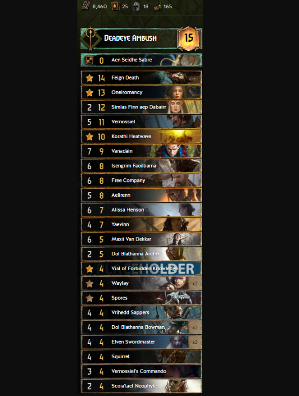 Deadeye Ambush elves are still a strong choice for this meta. They haven’t been touched by a nerf hammer recently. It feels a bit weaker than Harmony, but it can still generate a lot of points. Your core cards will be Feign Death,