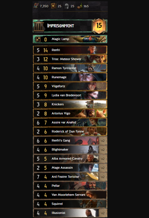 At first glance this list doesn’t have a lot of points. However it has our old friend Renfri that still plays for a solid amount of points by herself. Even though you need to run 25 units in order to benefit from Renfri, this list actually has some pretty good consistency with Knickers, Renfri’s Gang and Blightmakers. There is Vilgefortz for tall punishment; it can be great against Koshcheys or any other boosted units, for that matter. The list runs 2 Alba Armored Cavalry, which you can make into 3 with Ramon Tyrconell. You should be able to respond to most of your opponent’s engines since you will have five locks in total, including your lead ability. If you get to long round 3, try placing your high-based unity on the same row to get the full benefit of Triss: Meteor Shower. Coupled with Ranfri, you can make a solid amount of points in the last round.