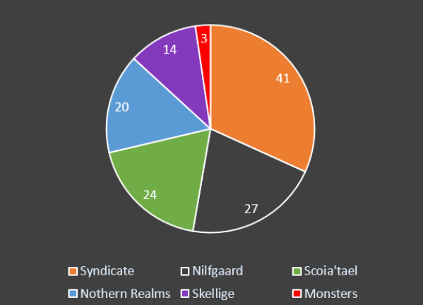 Nilfagaard came second place, with fifteen players opting to go for the faction that achieved its resurgence late in the meta. Twelve players, 80% in total, picked Imprisonment as their leader. Three players 20% chose Double Cross instead. The most popular cards were Renfri, Vilgefortz, Roderick, Lydia and Braathens.