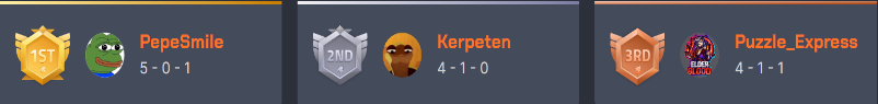 Kerpeten didn’t have an opponent in the first round of the first day, and therefore got awarded a win. He managed to squeeze between PepeSmile who ended up in first place of the leaderboard and Puzzle_Express who earned himself a spot in third place. Kerpeten ended his day with a score of four(+1) wins and 1 loss. His only loss came from PepeSmile, who had a great first day.