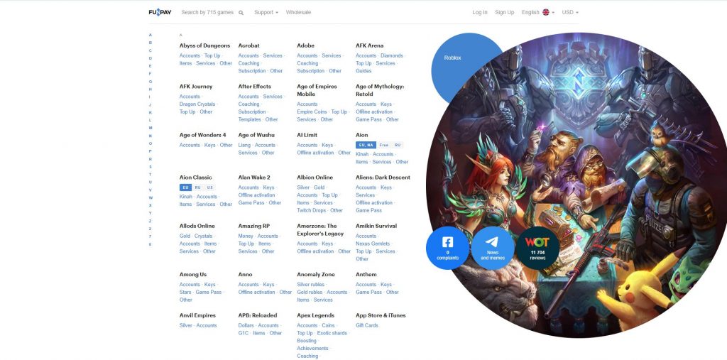 • In-game goods platforms (like G2G or FunPay) offer accounts, currency, and power leveling.