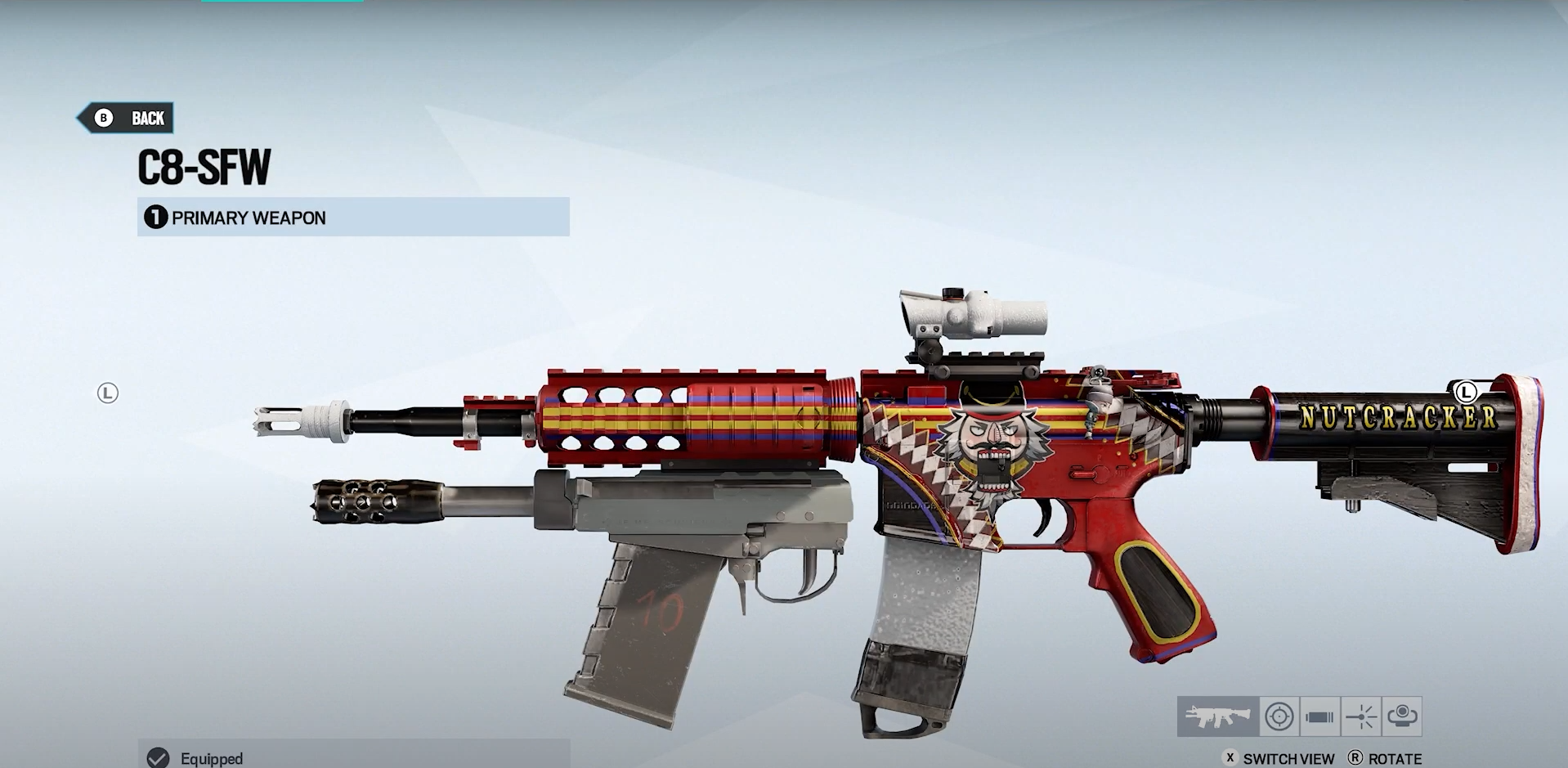 Making its way into third place is the Royal Jaw weapon skin, which is known for holding the most unique wooden look to your weapon. It was introduced from December 14, 2021, to January 4, 2022, during the Snow Brawl, part of the Buck Nutcracker Bundle, and was purchasable for 1680 R6 Credits. From the straight, bold stripes to the zig-zagged edges, this weapon skin is sure to wow your opponents enough to distract them. The skin brings out its richest reds and its deepest yellows, bringing a feeling of warmth and coziness. With a Nutcracker head placed on the side, it really symbolizes the monumental joys of the Christmas season. We would definitely like to see it return again this season!