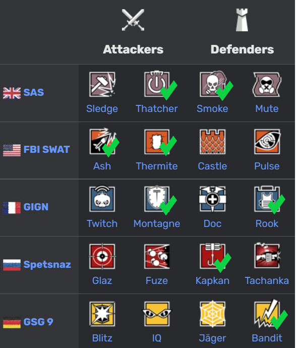 - Thatcher. This guy has an EMP grenade that will destroy the enemy’s electronics: cameras, drones, traps. Thatcher is pretty useful for your team and will help you to enter locations easily.