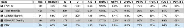 Fnatic were the worst team on Abyss during the tournament losing the map with a record of 0–2. While DRX and Team Heretics were the best teams on the map with a record of 3–1 and 6–1 respectively. EDward Gaming and Leviatan also had positive records on the map.
