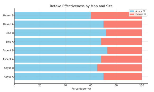 The fact is that many teams probably get into a trap of thinking that a cartain map is favorable for retake. While it is true that Abyss does record a 34% Retake Rate (Fair Situations) across both sites which is just above average and not as hard as certain maps like Split or Ascent which have Retake Rate far below the 30% mark.