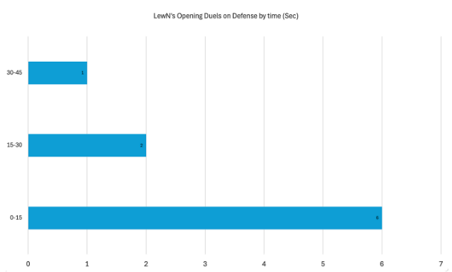 Just when I thought most team’s loved giving up sites and retaking more on Abyss, BBL Esports came up with an absolute defensive masterclass against Fnatic. Fnatic were restricted to a Plant Percentage of 50%. BBL won the half 9–3 and ended up taking the game.The BBL Performance proved far superior than playing passive and retake on Abyss. They played an aggressive style of defence that yielded them far better results than most teams. Just how aggressive did they play? Their Duelist LewN went 6–3 on Defense on Opening Kills. But that’s not it, in fact a majority of LewN’s opening engagements came within 15 seconds of the round start.