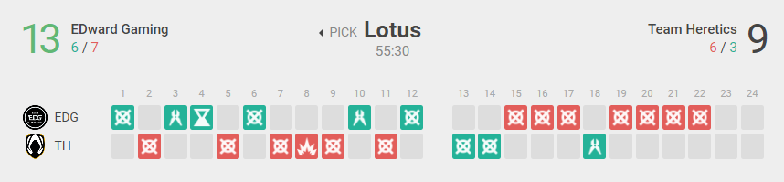 Now that the two teams are tied 1-1, both teams are ready to start Lotus on the third map. EDG began to on defense and denied the pistol round from Team Heretics, but Team Heretics clapped back and won their eco round; both teams fought hard and strong in the first half, ending it with a tie score of 6-6. EDG showed their strong side in attack, winning multiple strikes to close it out at 13-9, with CHICHOO, this time being on the top of the scoreboard as an Omen with 27 kills.