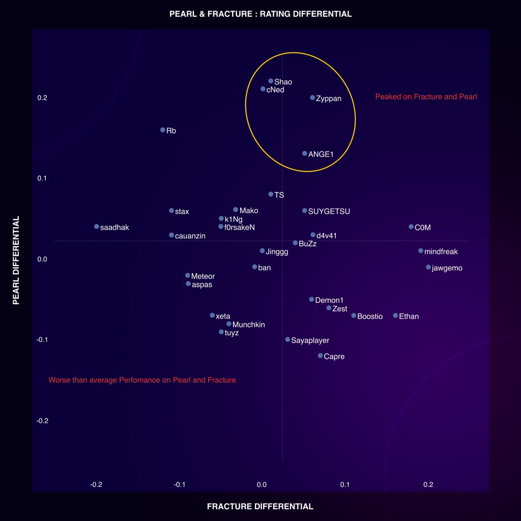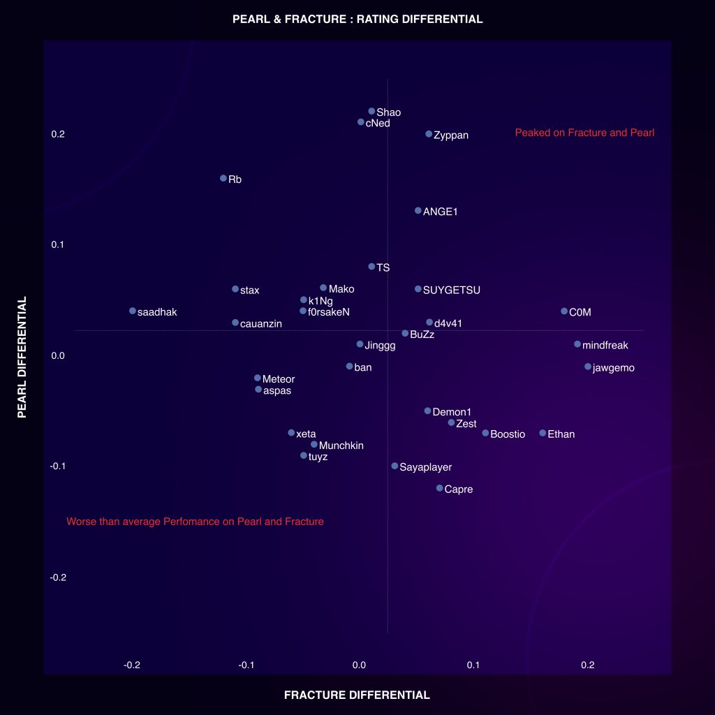 Finally let’s take a look at the players who actually peaked on this map, above and beyond their peers. From just a glance at the graph you can say jawgemo (+0.20) and Shao (+0.23) were players who peaked the most on Fracture and Pearl respectively. However, that’s far from the truth.