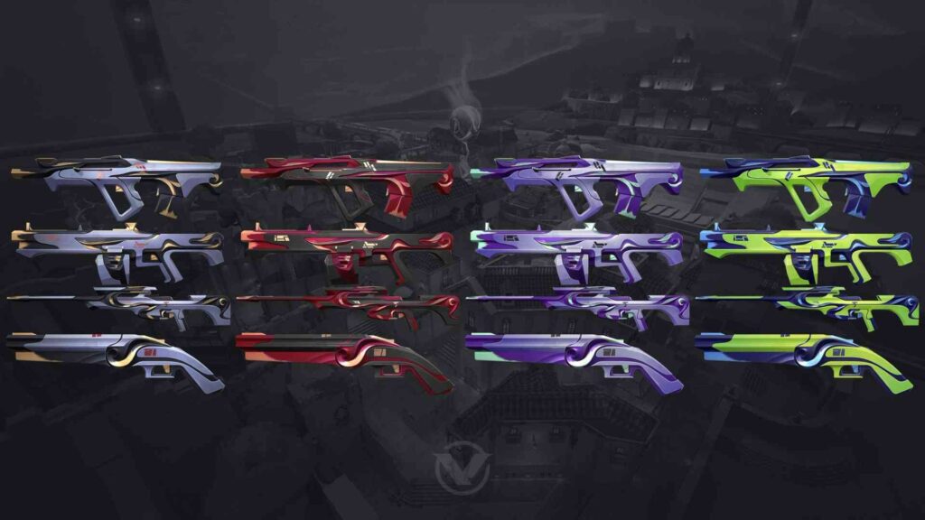 This act seems like Valorant has gone with quite colorful schemes for their latest skins. Plus they’ve made sure there are skins available for each gun in the game. One thing worth noting is that the skins available in each battle pass are exclusive. This means once the battle pass expires they’re impossible to unlock. In the latest battle pass, we have three variants of skins available to unlock; Signature, Tilde, and Topodek.