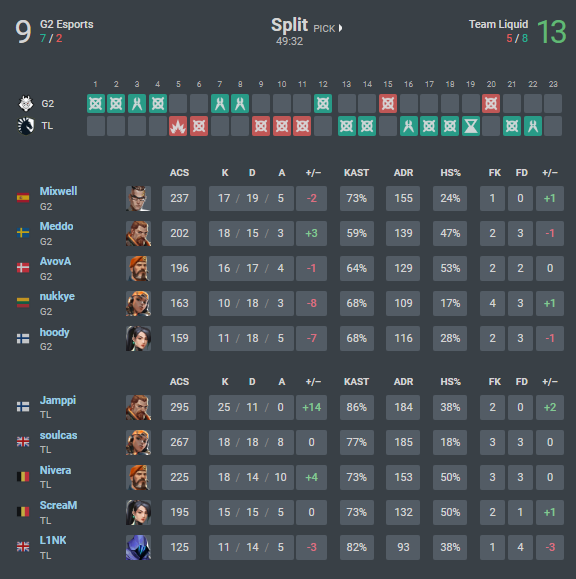 Team Liquid clearly is not letting G2 set up the rounds in the way they want to. With the amount of utility they possess, they can stall for as long as they need to while also being able to make ‘ratty’ plays with the Sage walls.