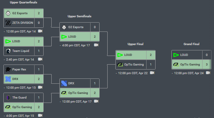 In the playoffs, OpTic faced The Guard and DRX, both of whom they dealt with swiftly. In the Upper Bracket Finals, they met their eventual finalists, LOUD, to whom they lost 2-1. Dropping to the lower brackets again, OpTic beat both the Asian representatives in Paper Rex and ZETA DIVISION to finally meet LOUD in the Grand Finals. This time, they made sure not to make the same mistakes and came out on top as winners of VCT Stage 1: Masters ReykjavÃk.