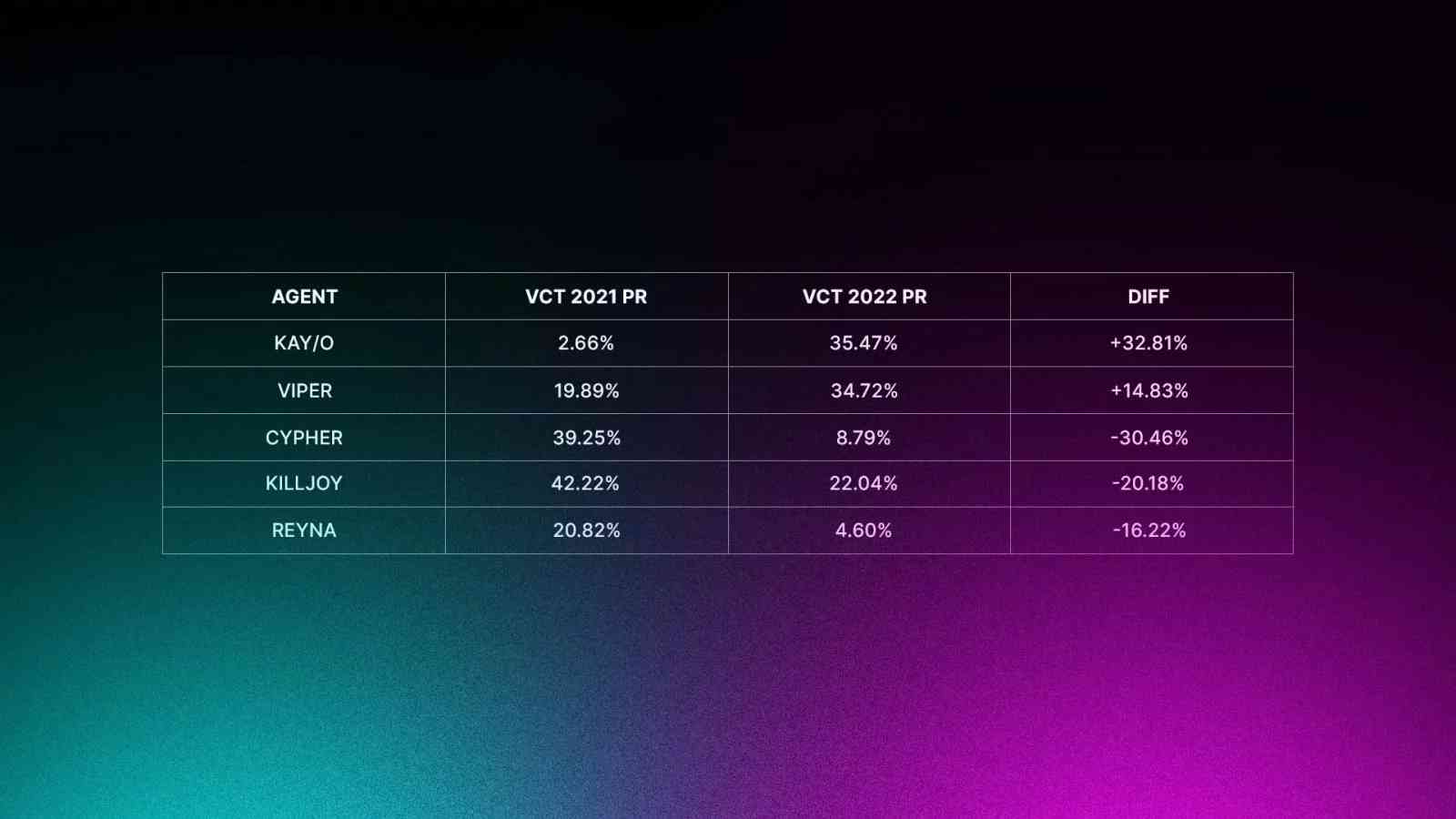 There are some notable changes in the pick rates between the two VCTs; These changes occur depending on the agents’ state such as buffs, nerfs and the addition of new agents.