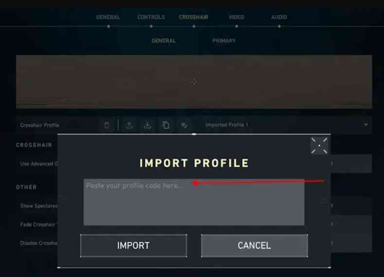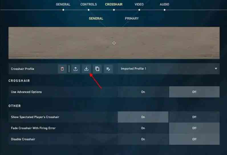 Players can import or export custom scope profile codes in Valorant. To do this, you can simply copy a crosshair you like. Find the down arrow icon under the import name in the main section.