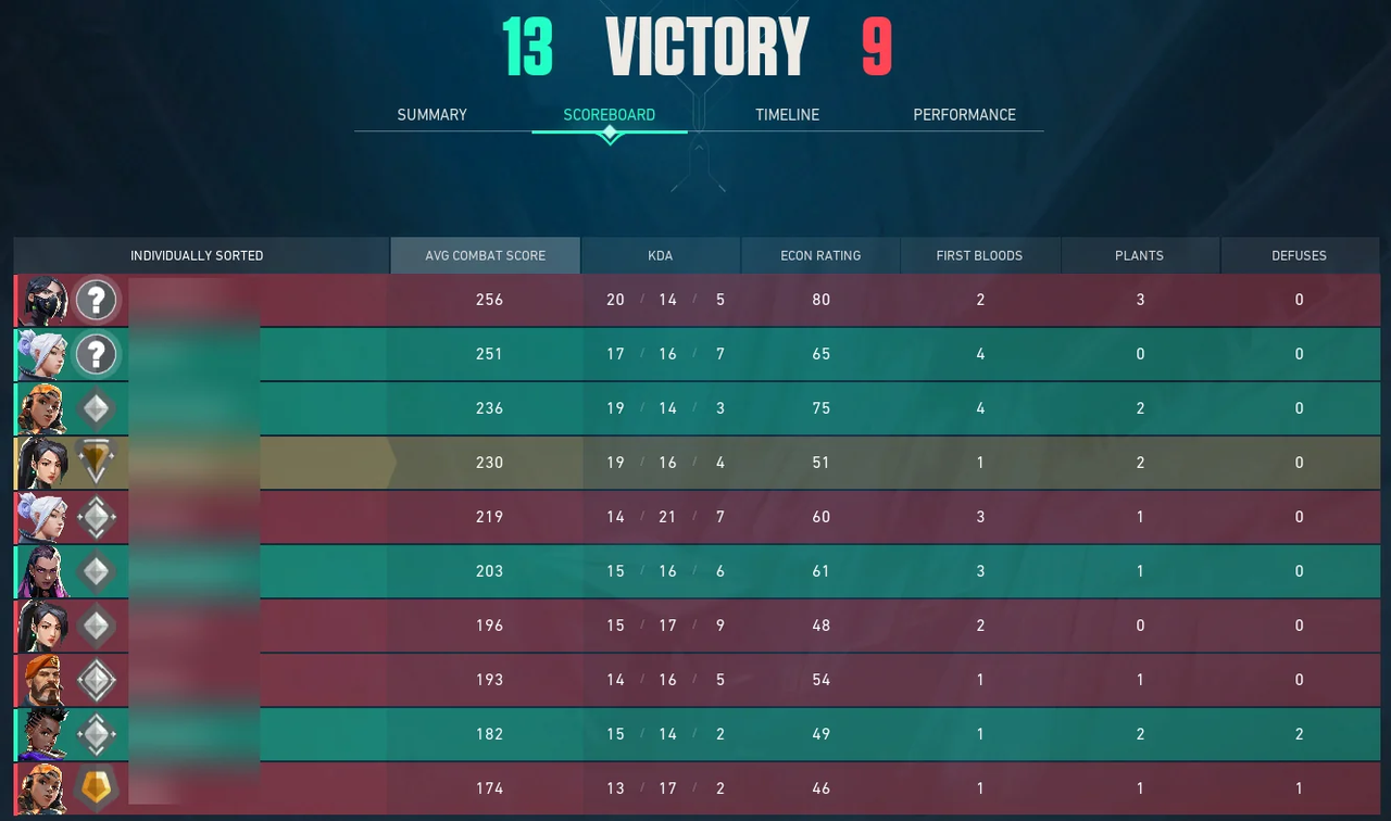 • Individual Performance: Statistics like kills, deaths, assists, spike plants, defuses, and overall contribution to the team are considered.