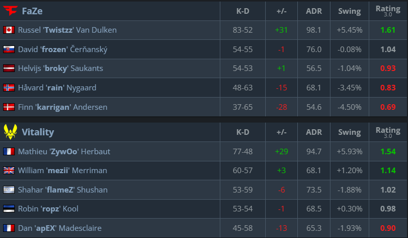 The second-best player for Vitality was Mezii, who scored a rating of 1.14. ropz doesn’t seem to have his best tournament, but he made just enough impact to help his team win. It’s their best chance before the StarLadder Major to win another trophy and bring their confidence back.