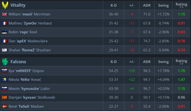 m0NESY is one of the main reasons behind the Falcons‘ success at this tournament, as he is the best-rated player at this tournament with a rating of 1.40. Kyousuke is another player to look for when the Falcons are playing, as he was at the top of the scoreboards for his team in most of the matches here at ESL Pro League. Kyxsan has struggled on big stages recently, but his growing experience should help him handle the pressure.