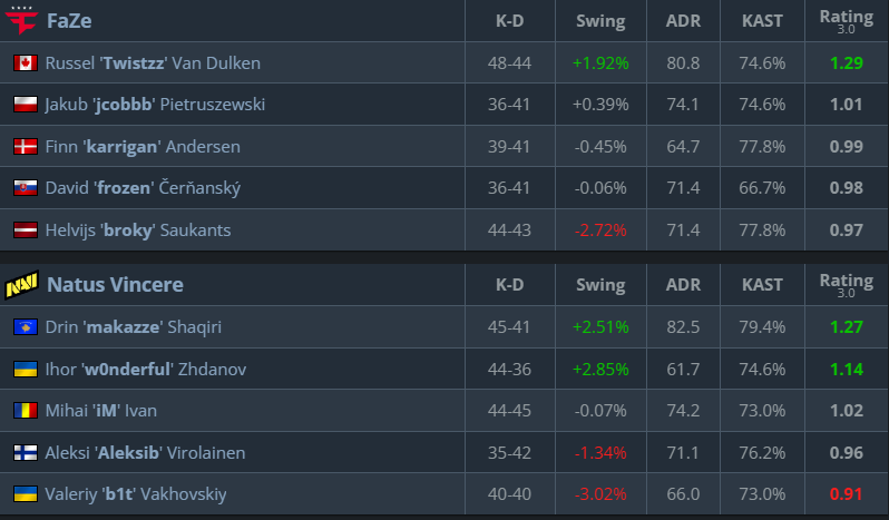 frozen may not have been consistently at his absolute peak, but he has returned to star form when it mattered most. The same can be said for Twistzz, who looks revitalized since rejoining FaZe – the team with which he enjoyed the greatest success of his career. Twistzz was the standout performer in FaZe’s crucial semi-final victory over Natus Vincere, finishing with a 1.29 rating.