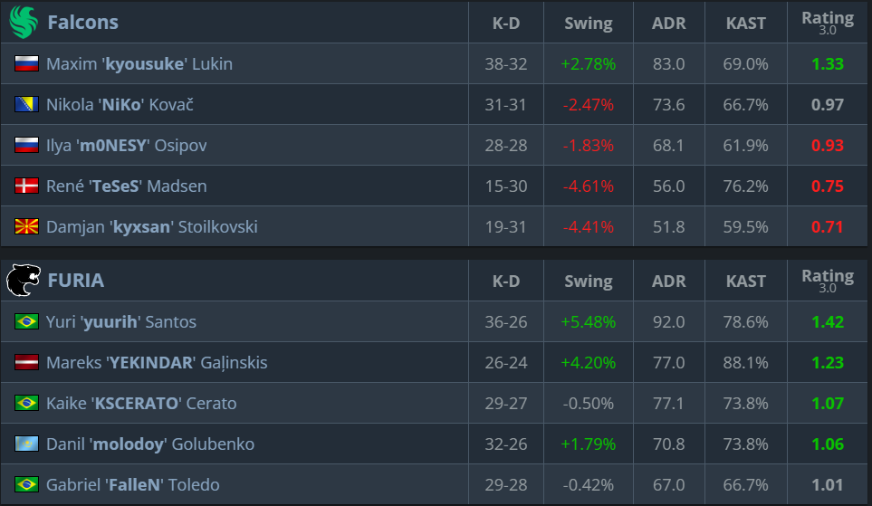Before the semi-final clash with Falcons, it was mostly molodoy and KSCERATO carrying the team, while yuurih and FalleN struggled to find consistency in their game. But when it mattered most, which is the semi-final match, both veterans stepped up – yuurih became the team’s top fragger, and FalleN delivered his best performance of the event.
