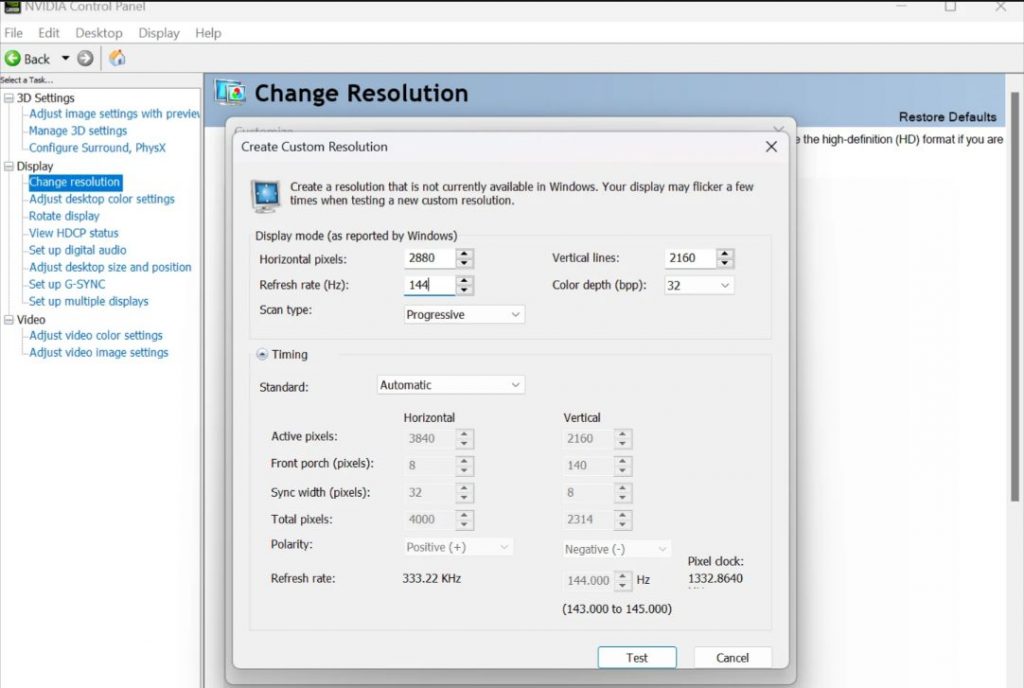 - Click Test. Your screen will flicker briefly — if it displays correctly, click Yes to save.