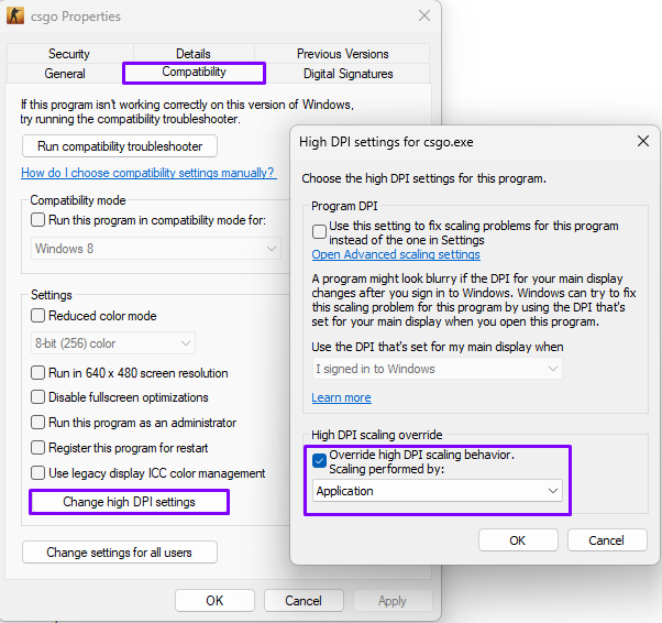 - Click Change high DPI settings → Override high DPI scaling behavior